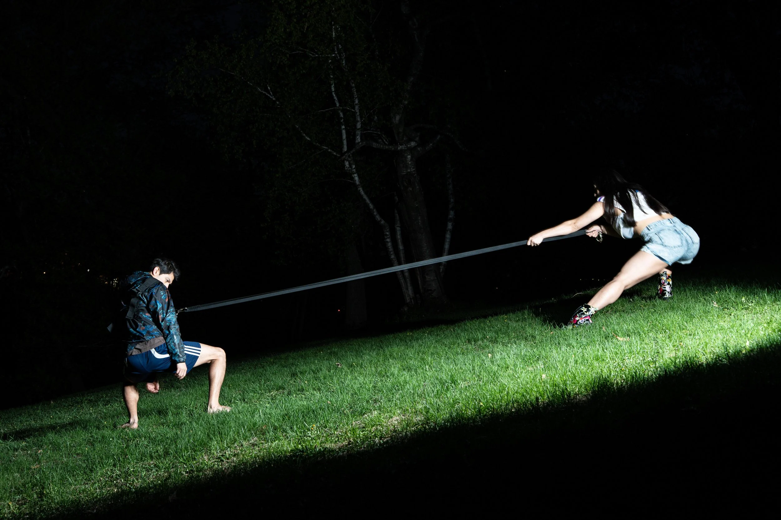 In each performance, D and I are at a club. Amidst a forest. In a gym. On a runway. Across a river. In a room, staring at the mirror. Walking towards the mirror, and away, and so beyond the mirror.